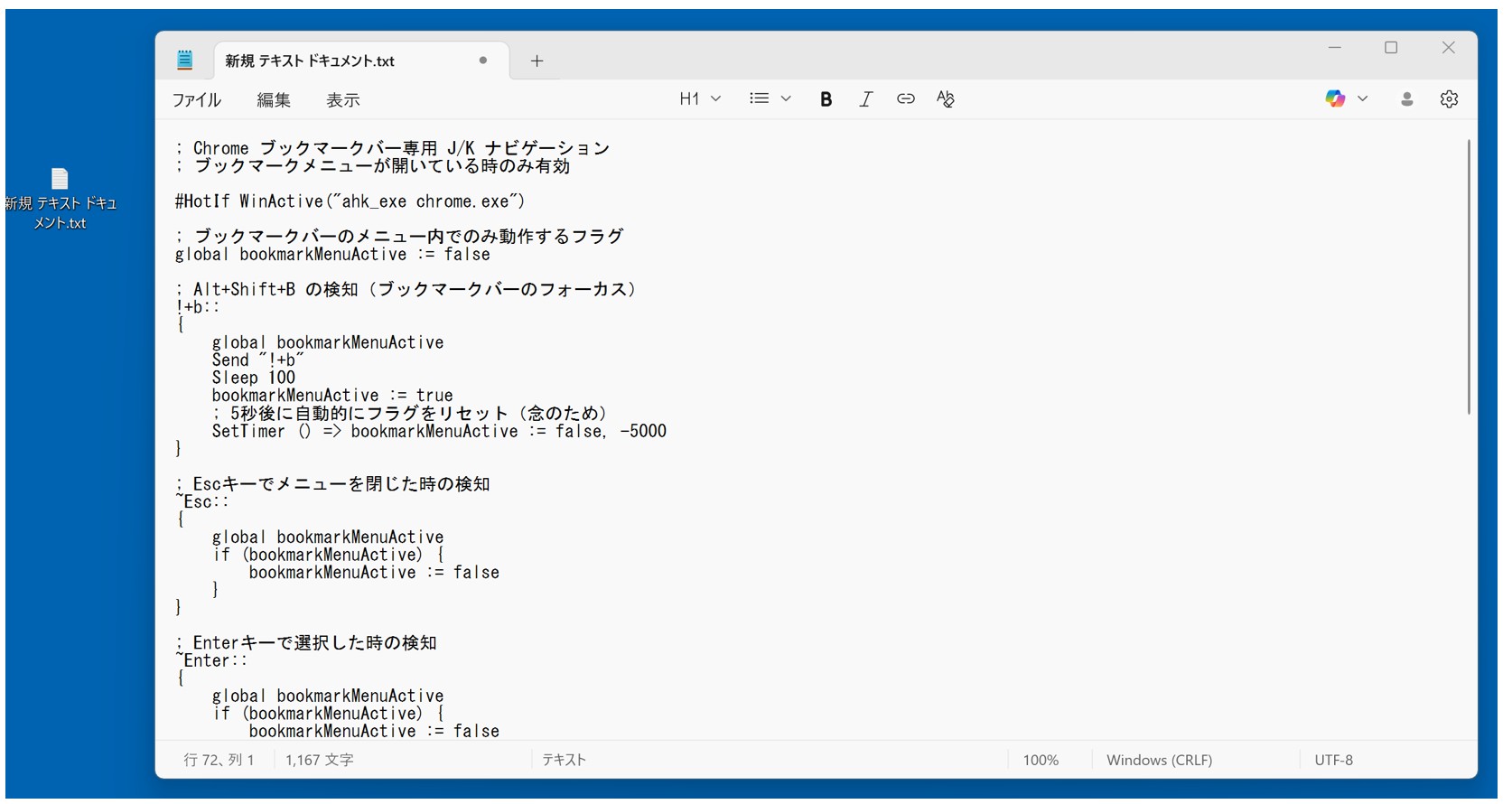 2.テキストエディタでコードを記述し、 .ahk ファイルとして保存