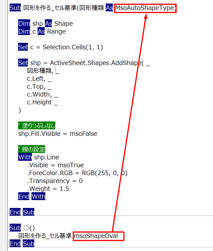 「MsoAutoShapeType」は、「個別コードで設定した図形の形が入ってくる」とご理解いただければOKです。