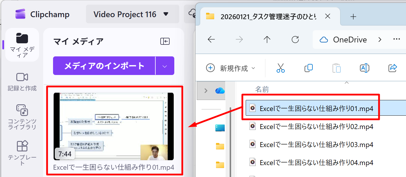 ②OBSで収録したMP4ファイルをドラッグ
