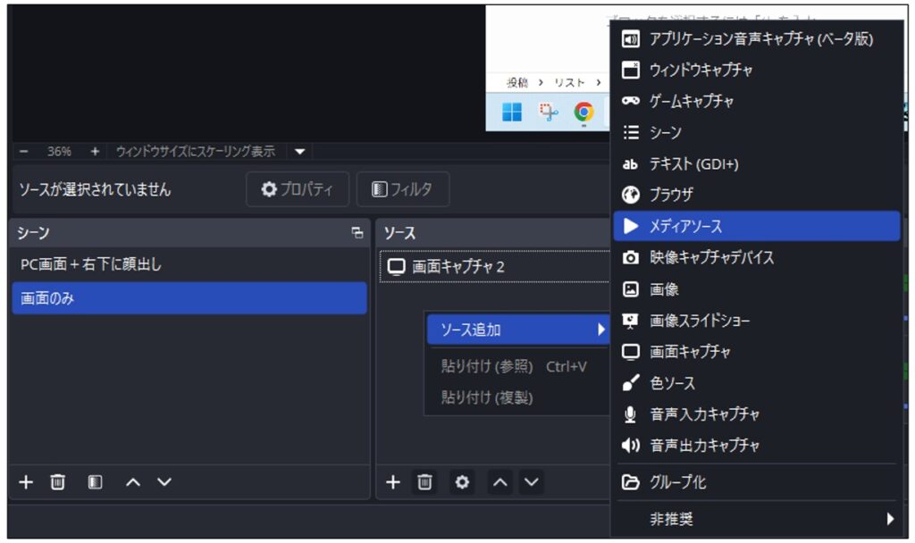 左下の『シーン』を切り替えることで、顔出し+PC画面のような形にもできます。
