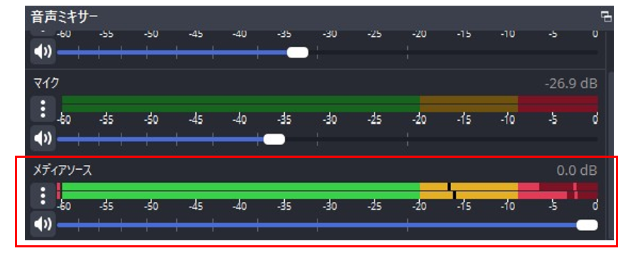 メディアソースの音声マーク🔊のバーを動かすことで、調整ができます。