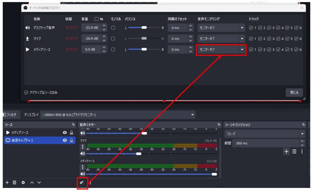このうち、メディアソースの『音声モニタリング』について、以下の3種類があります。