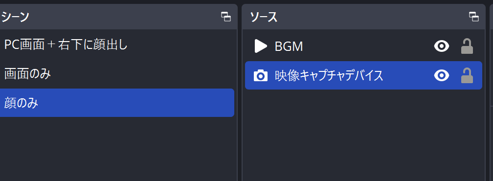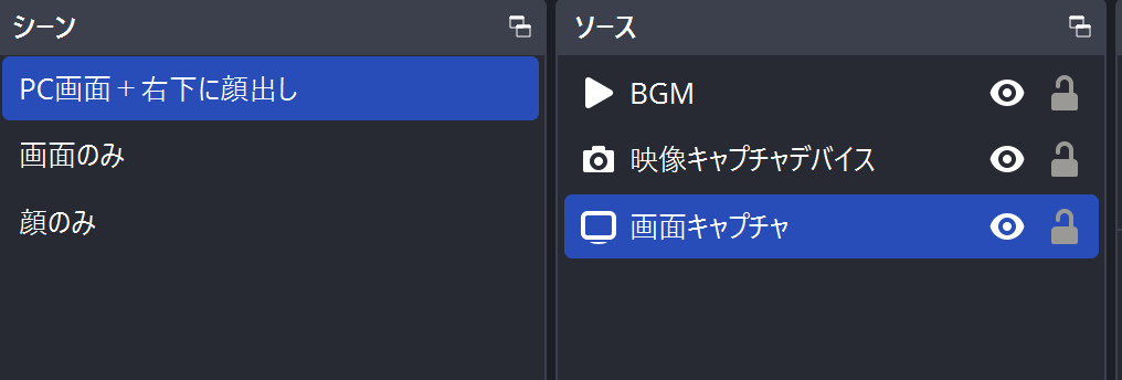 OBS Studioには『シーン』と呼ばれる画面レイアウトの仕組みがあり、画面表示の仕方などを用途に応じて複数設定できます。