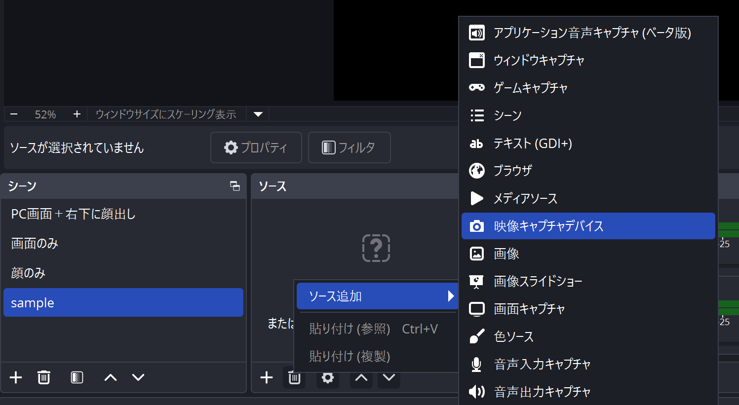 『映像キャプチャデバイス』というのが、カメラで自分自身を映すソース(機能)です。