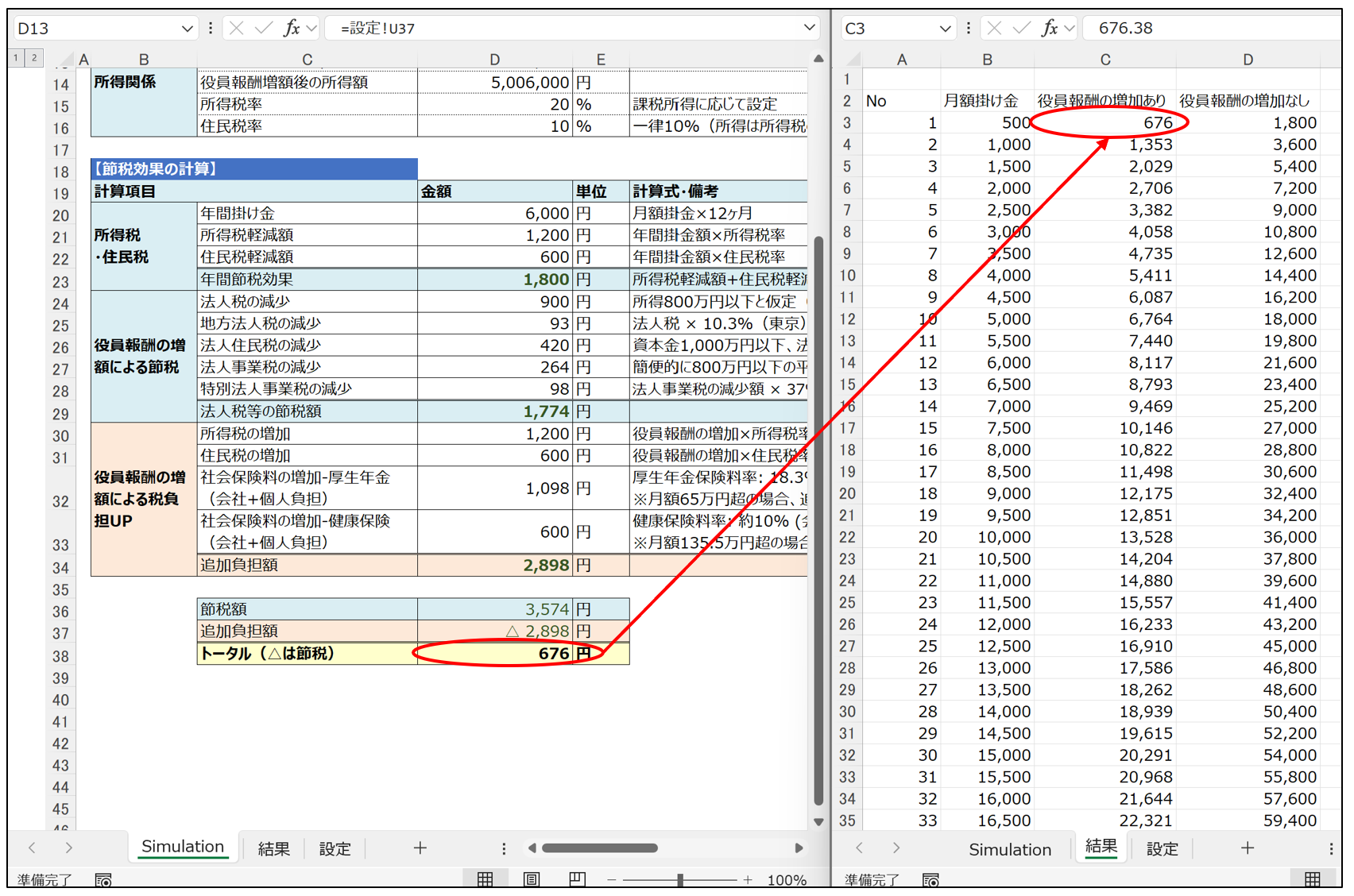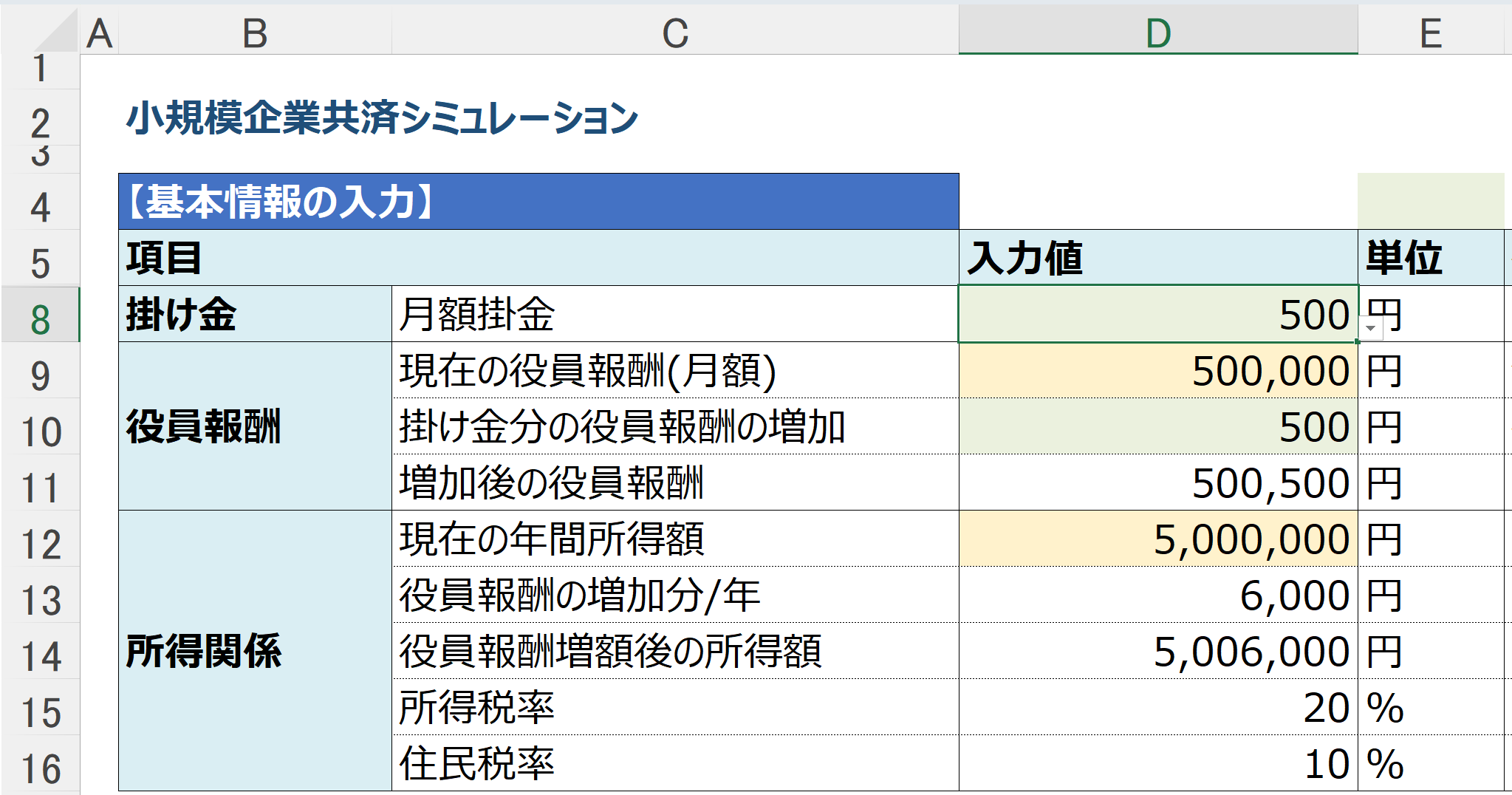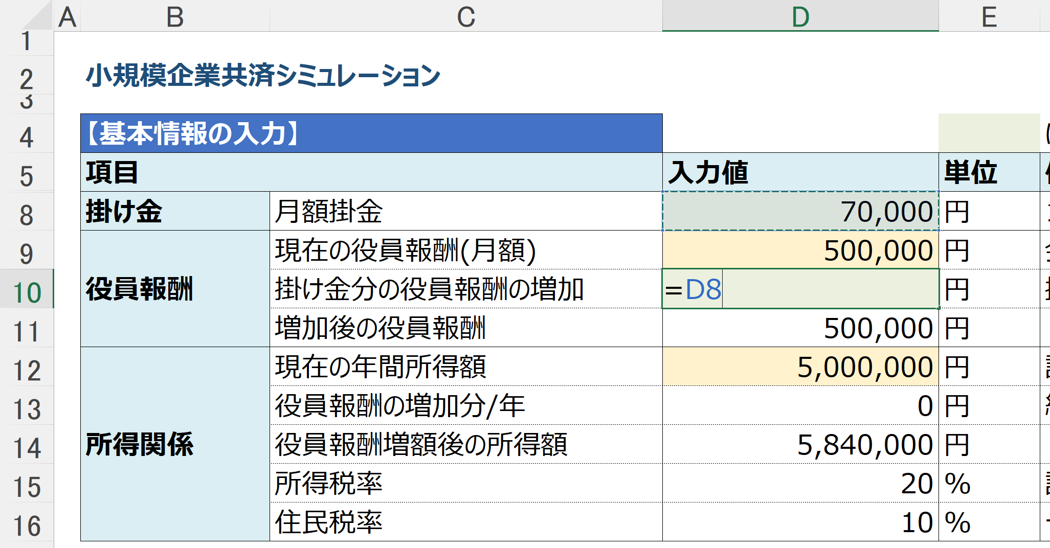 Sheets("Simulation").Range("D8").Value = i * 500 '掛け金と役員報酬を設定